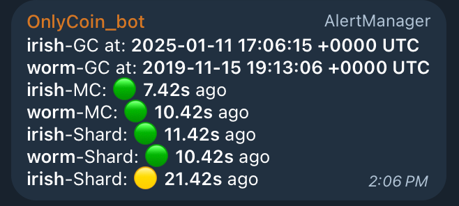 And of course, we configured fancy status in telegram via Prometheus & alert manager: